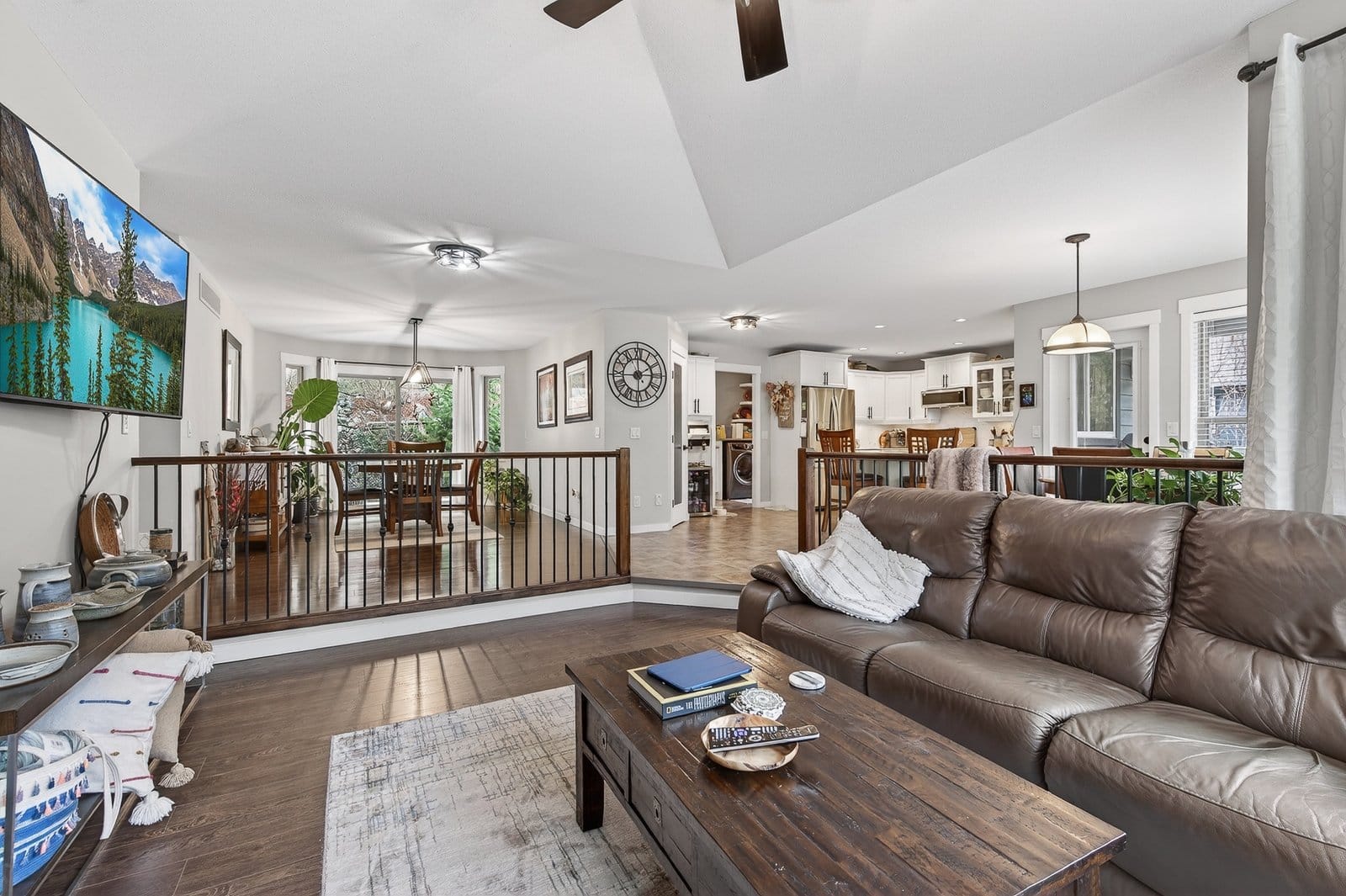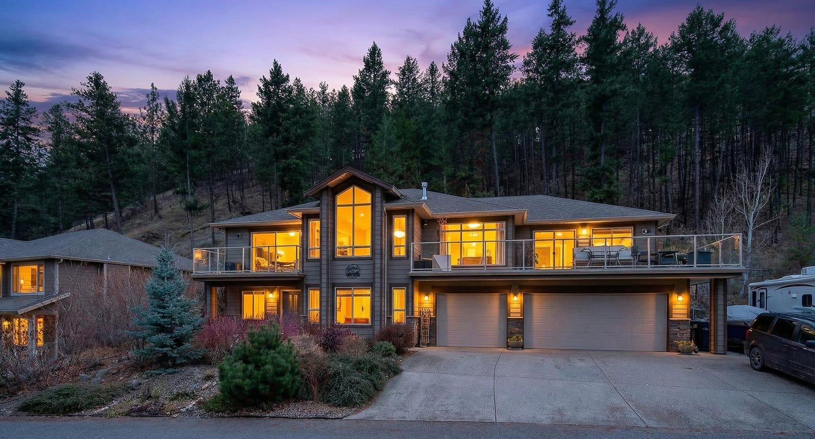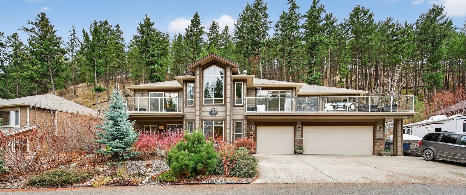 Located on a quiet cul-de-sac just steps from Rose Valley Regional Park, this custom-built home offers privacy, space, and direct access to over 40 km of hiking and biking trails with stunning views. Situated on a rare 0.40 acre lot, the property features a natural hillside backdrop, nearby Faulkner Creek, RV parking, and a traffic-calmed lane shared by only four homes—creating a peaceful setting. Built in 2010, this spacious 3,652 sq. ft. grade-level entry home offers a bright open-concept layout with over 2,100 sq. ft. on the main floor. The main level includes three bedrooms, inviting living and family rooms connected by a double-sided fireplace, and access to a large partially covered wraparound deck with gas BBQ hookup and outdoor water tap—perfect for entertaining and enjoying the natural setting. The primary suite features a private balcony, walk-in closet, and four-piece ensuite. Main floor laundry adds convenience, while the lower level offers additional bedrooms, flexible living space, and storage plumbed for a potential second laundry area. Additional features include a high-efficiency furnace, central air conditioning, central vacuum, drought-tolerant landscaping, and an oversized triple garage with extra-deep bays and water access. Rose Valley is one of West Kelowna’s most sought-after neighbourhoods, offering access to Mar Jok Elementary, sports fields, Rosewood Centre, and optional community amenities including pool, tennis courts, and garden spaces.