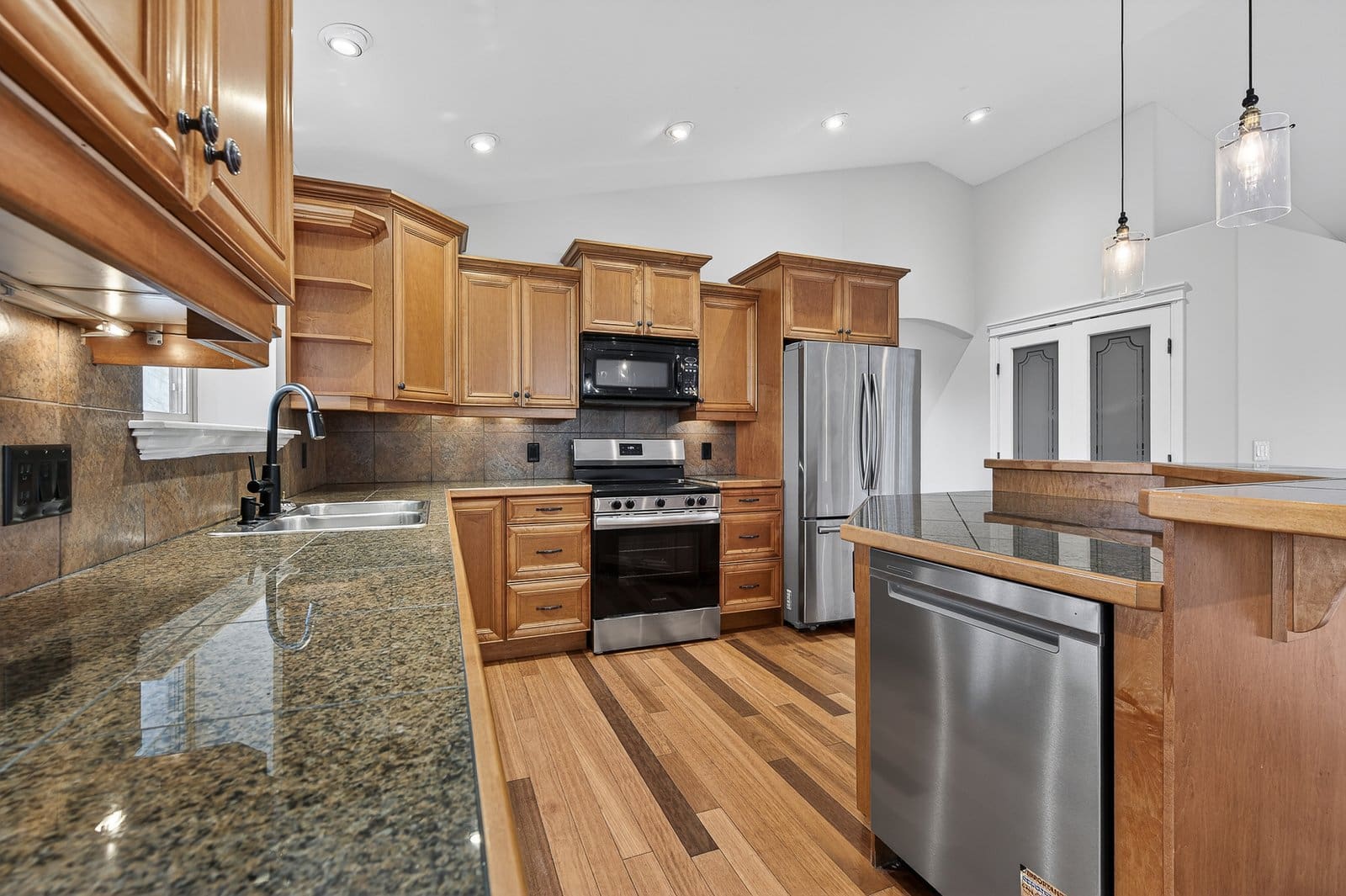 Welcome to 327 Quilchena Drive — a well-designed family home in a highly desirable neighbourhood. The main level features vaulted ceilings and a bright, open-concept kitchen, dining, and living area that keeps everyone connected. The kitchen offers direct access to a large covered balcony with lake, mountain, and city views — also accessible from the primary bedroom. Upstairs includes the primary suite with a 4-piece ensuite, a second bedroom, and an additional full bathroom — ideal for young children or a home office setup. The walk-out lower level adds valuable living space with a generous family room, two additional bedrooms, a full bathroom, laundry, and ample storage. This layout provides flexibility for growing families, teenagers, guests, or multi-use space. The fully landscaped yard is easy to maintain and offers space for outdoor play and entertaining. Located steps from parks, transit, and Chute Lake Elementary, this home combines practical living space with everyday convenience. Functional, spacious, and move-in ready — a solid option for families looking for room to grow. All information and measurements are approximate.